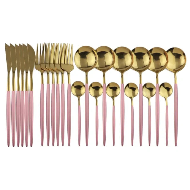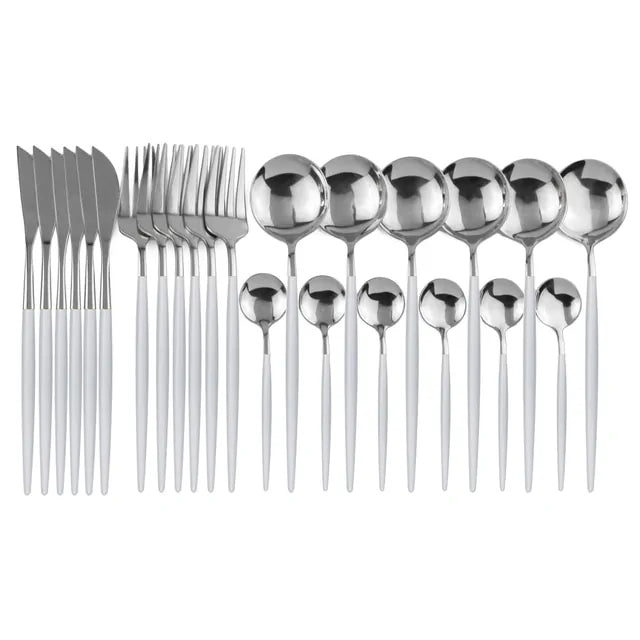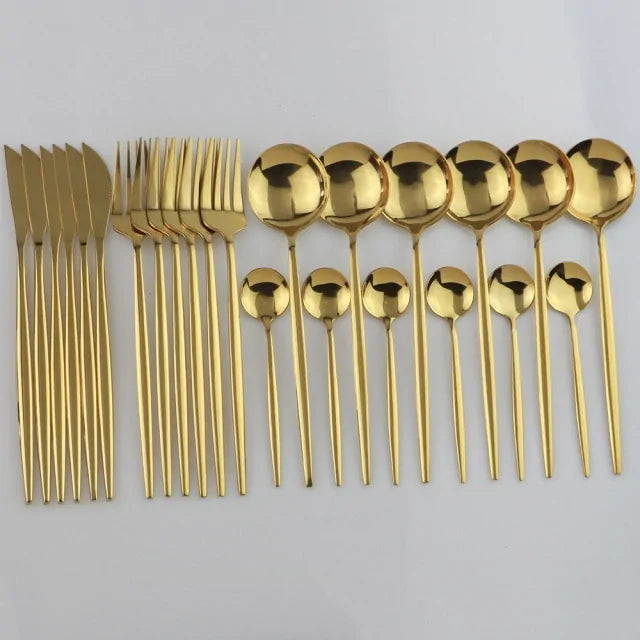 Add a touch of luxury to your dining experience with this 24-piece black gold dinnerware set. Made from stainless steel with a good mirror polish, this set is dishwasher safe and perfect for everyday use or special occasions.