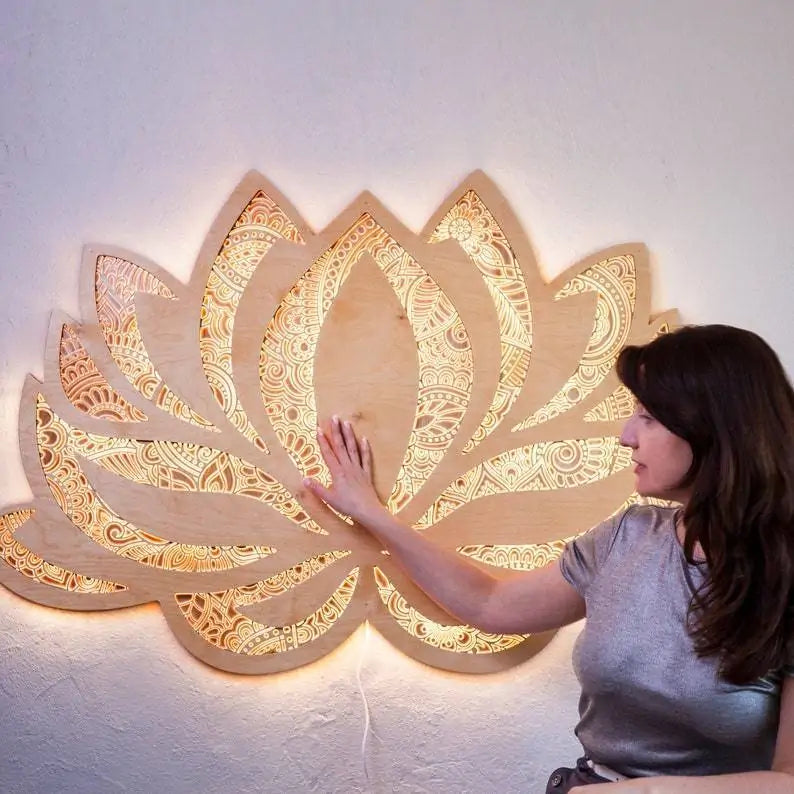 Looking for a unique and beautiful way to decorate your yoga room? Look no further than these decorative art ornaments! Made from wood, each one is laser-cut and intricately designed with a lotus flower mandala. They make the perfect night light, adding a calming and serene ambiance to any space. Plus, they make great gifts for any yoga lover in your life!