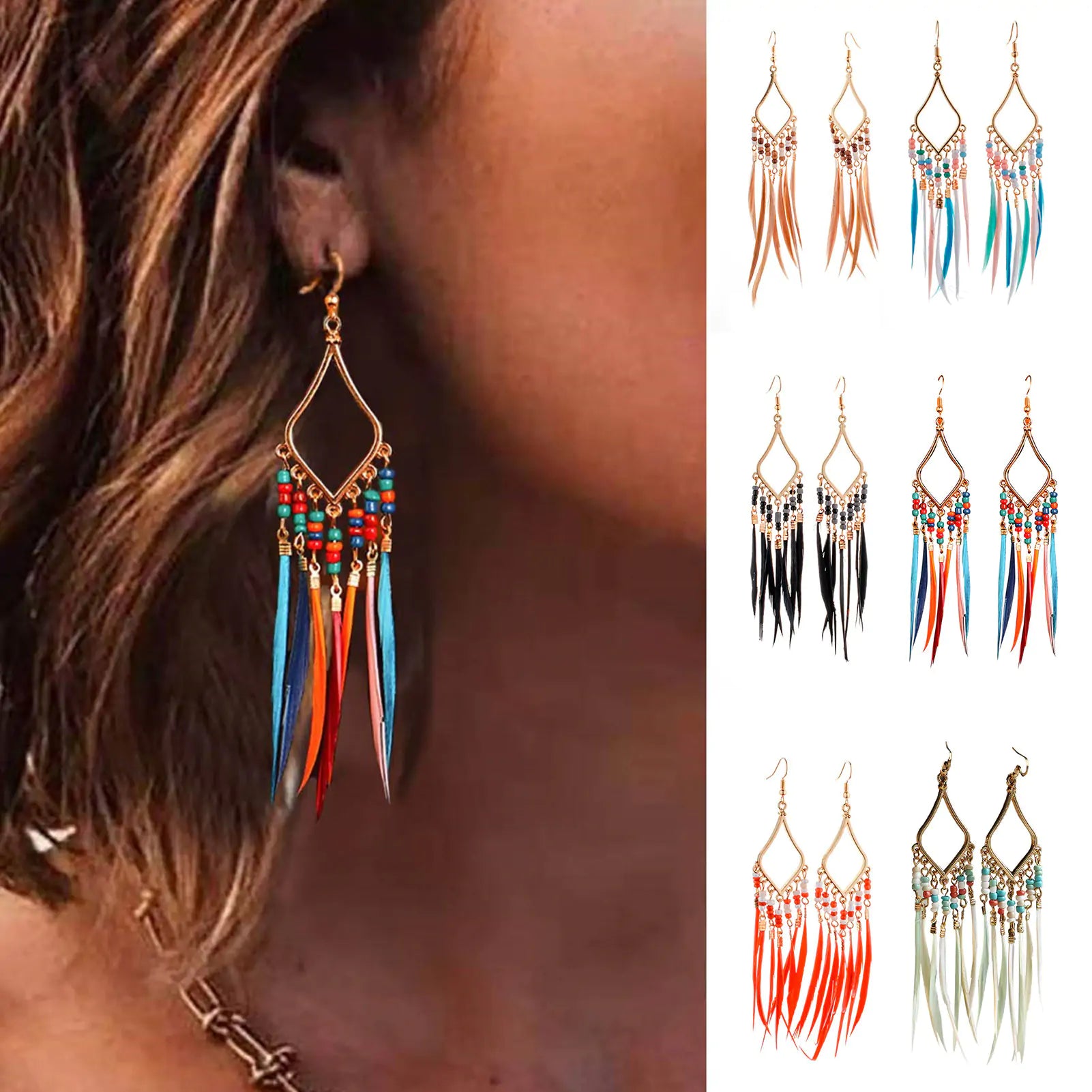Introducing our Tassels Feather Earrings! These earrings are perfect for adding a touch of elegance and charm to any outfit. They are made with colorful beads and tassels and have elastic buckles for easy on and off. They are also wide enough to be worn on any occasion, from parties to everyday wear. Plus, they make an ideal gift for any special occasion. So don't hesitate, grab a pair of our Tassels Feather Earrings today!